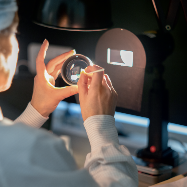 Warum das so ist, erlebt man in dem komplett verdunkelten Testraum direkt neben der Montage. Hier werden ausnahmslos alle Objektive geprüft, bevor sie das Haus verlassen. Es ist eine Art Kinosaal mit Projektor. Projiziert wird eine Schablone, auf der Tausende von Markierungen zu sehen sind: sogenannte „Siemenssterne“, Strichraster und Formatmarkierungen, an denen die Abbildungsqualität hinsichtlich Schärfe, Auflösung oder Verzeichnung abgelesen werden kann. „Unsere Objektive haben ein Bildauflösungsvermögen von über 200 Linienpaare pro Millimeter“, erklärt Dr. Aurelian Dodoc. „Das ist eigentlich unvorstellbar. Aber wenn man sich überlegt, dass in den größten Kinosälen das Bildformat bis zu 80 Quadratmeter erreicht, bekommt man schon eine Vorstellung davon, in welchen Dimensionen wir uns bewegen.“