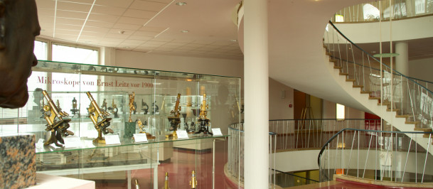 Wer das Neue Rathaus Wetzlar betritt, verspürt noch heute den 50er-Jahre-Charme des ehemaligen Leitz Verwaltungsgebäudes. Über das berühmte schneckenförmige Treppenhaus gelangt man in das 3. Stockwerk zur Sammlung historischer Mikroskope. Der Rundgang durch die Geschichte reicht von einer Replik des berühmten Leeuwenhoek-Mikroskops über eines der ersten Mikroskope von Carl Kellner bis zu den wegweisenden mikroskopischen Instrumenten von Leitz und später Leica Microsystems. Hier kann man die Geschichte der Optik hautnah erleben!