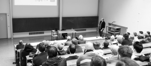 Dr.-Ing. Sebastian Karl, wissenschaftlicher Mitarbeiter am Institut für Aerodynamik und Strömungstechnik, Deutsches Zentrum für Luft- und Raumfahrt (DLR), Göttingen, im Hörsaal III der Physikalischen Institute.