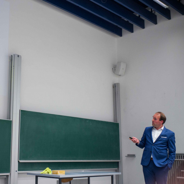 Der Vortrag von Dr.-Ing. Franz Georg Hey fand als Präsenzveranstaltung an der Justus-Liebig-Universität statt, konnte aber auch online verfolgt werden. Nach dem Vortrag bot ein kleiner Empfang im Foyer Zeit für Gespräche oder vertiefende Diskussionen.
