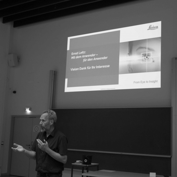Der Vortrag widmete sich zunächst der Entstehung und Entwicklung der Lichtmikroskopie und der Entdeckung des für das menschliche Auge Unsichtbaren durch die Universalgelehrten des 16. bis 19. Jahrhunderts. Durch die Serienfertigung von Mikroskopen und Mikrofotografie-Systemen, zu der Leitz einen wichtigen Beitrag leisten konnte, wurde die Lichtmikroskopie und die Kameradokumentation einer breiteren Anzahl an Forschern zugänglich. Dies führte zu einem Aufschwung der Wissenschaften und förderte die Aufspaltung in Spezialdisziplinen, wie z. B. der Entdeckung und Erforschung von Krankheitserregern, deren Übertragungswegen und Gegenmitteln.