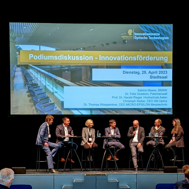 Eine Podiumsdiskussion zum Thema „Innovations- und Start-up-Förderung“ rundete den fachlichen Teil des ersten Tages ab. Dr. Andreas Ehrhardt und Nathalie Hoppe, Marketing bei Photonics BW, luden Sabine Maass, Referatsleiterin im BMWK, Dr. Felix Grasbon, Prof. Dr. Harald Riegel, Rektor der Hochschule Aalen, Christoph Sieber, CEO Sill Optics, und Dr. Thomas Wisspeintner ein, um das Topthema „Innovation und Start-up-Förderung“ von unterschiedlichen Seiten zu beleuchten und neue Wege aufzuzeigen. Im Mittelpunkt der Diskussion standen Innovationspotenziale, aber auch Innovationshemmnisse, Möglichkeiten zur Innovationsförderung in der Photonik-Branche und die Verwertung von Forschungsergebnissen sowie die Start-up-Förderung über verschiedene Möglichkeiten.