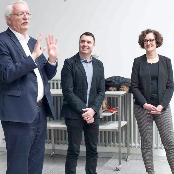 Gruppenbild mit Dame: (v.l.n.r) Manfred Wagner, Oberbürgermeister der Stadt Wetzlar; Prof. Dr. Thomas Sure, Technische Hochschule Mittelhessen; Dr. Andreas Dorsel, Mitglied der Geschäftsleitung Carl Zeiss SMT, Oberkochen; Prof. Dr. Peter J. Klar, Direktor des I. Physikalischen Instituts an der JLU Gießen; Katrin Ariki, Standortleiterin Carl Zeiss SMT, Wetzlar; Rainer Dietrich, Wirtschaftsförderung der Stadt Wetzlar; Dr. Gert Homm von der Deutschen Physikalischen Gesellschaft und Dietmar Persch, Hauptgeschäftsführer der IHK Lahn-Dill.